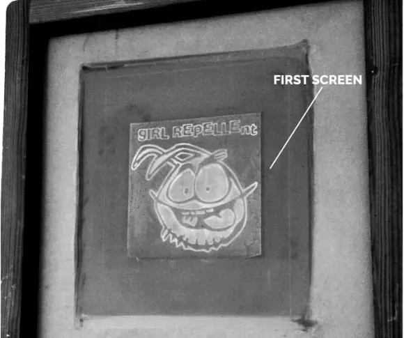 Dan acquired a table-top “press” from his roommate, who wisely decided to part ways with it after realizing how difficult it actually is to put ink on shirts well. The press consisted of a lazy Susan with clamps for the screens and two stationary boards to put the shirts on. And he bolted it to a wooden crate he found (see above).