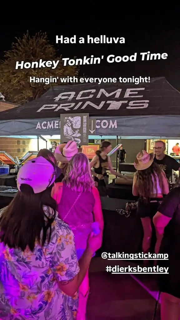 Live Printing at Dierks Bentley – Talking Stick Amphitheatre After the Dierks Bentley show ended, we wrangled the afterparty crowd onto the dance floor and to the Acme Prints tent. Read More